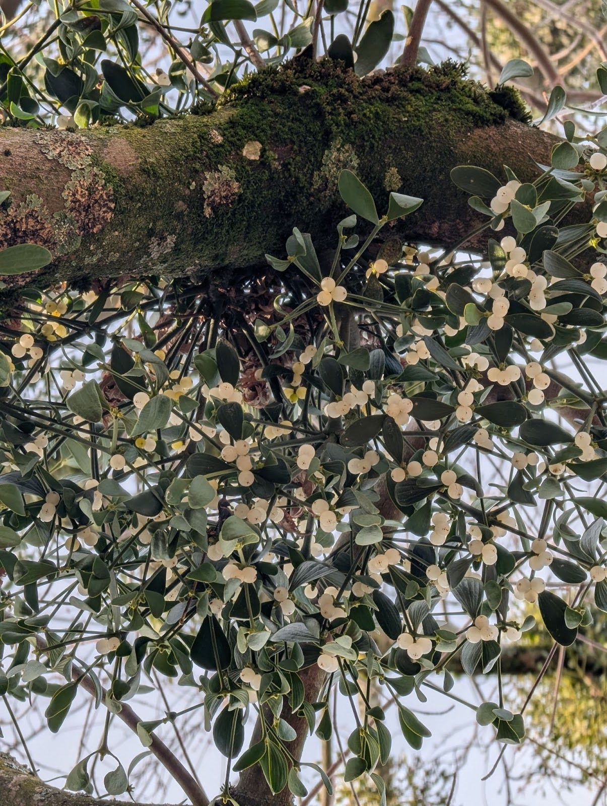 Alors que tout le reste du jardin est nu, le gui reste d’un vert éclatant, perché tout en haut des arbres.